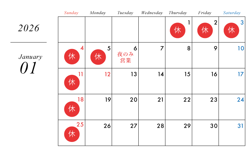 年末年始の営業に関して年内最終営業日が12月26日(金)年明けは1月6日(火)の夜から営業を再開いたします。